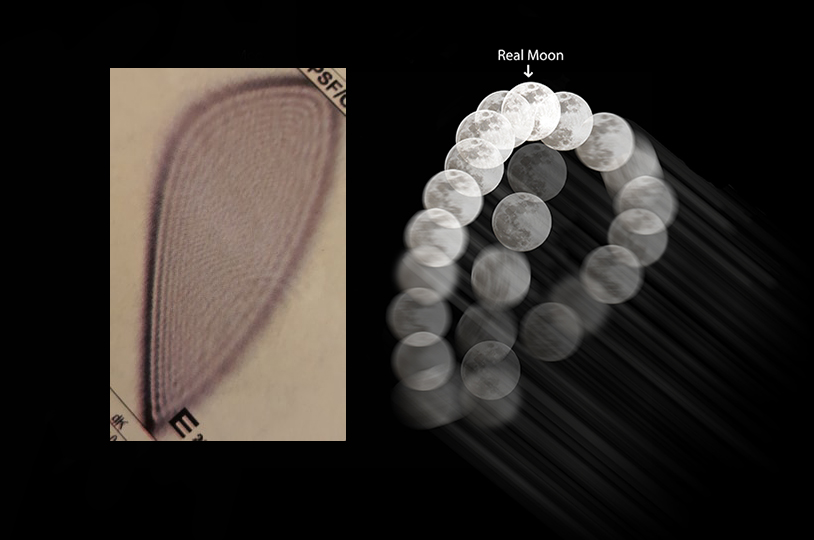 Dr. Thomas was very excited to see my Photoshop simulation. His computer program had created its own image of how my eye conditions distort the light vectors for each of my eyes. The warped shape their scans created for each eye was their technical, scientific representation of how my misshaped corneas refract light, and I instantly recognized that my light glare pattern for each eye matched the shapes their computer had generated. But the image I created of the moons in Photoshop was my detailed representation of what I physically see and the ophthalmologist’s excitement came from the fact that the positioning of the moons and distortions in my image very much matched the overall shape and line angles in his computer-generated images. He said for the first time someone had shown him a visual representation of their scan results.