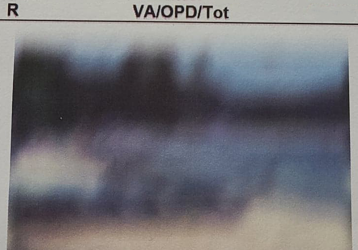 When they actually tried to work out a prescription lens for me they found it impossible. I was looking through their machine and they tried every lens slide combination imaginable to improve my sight, and it was like they were just swapping out one version of blur and distortion for another. I still couldn’t read anything on the chart and my eyes would just water constantly from trying to look at the backlit screen of letters with the ever-altering versions of distortion. In fact, it was harder to see with any prescription lens than without. I told them I had no ability to focus through the doubles to read. I could not focus, period. I was told that that was because the combination of the duplications from my Keratoconus on top of the extreme blur from my birth aberrations confound my brain too much. I could guess some letters, but they were only guesses. There is just too much going on with my eyes for me to be able to process.